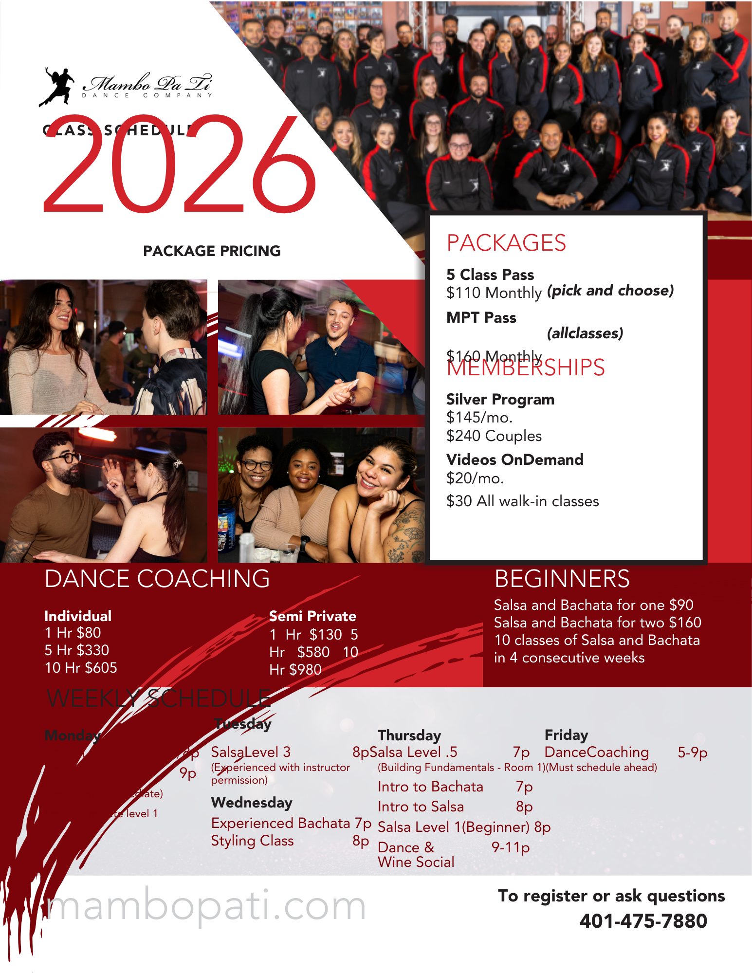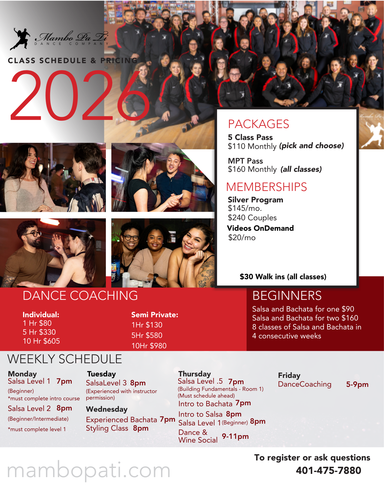 Mambo Pa Ti (MPT) offers affordable group classes, for beginners and professionals, providing over 30 hours of intensive studio training each week, in specialities like NewYork Salsa On2, and authentic Dominican Bachata, as well as dance coaching. ALL SALES ARE FINAL.